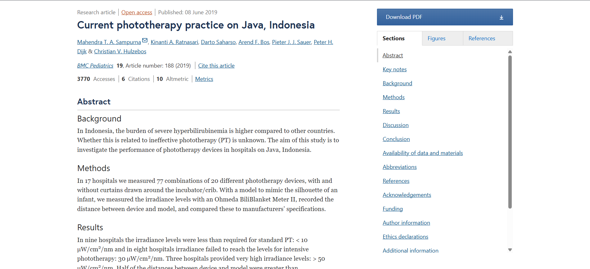 Di Indonesia, beban hiperbilirubinemia berat lebih tinggi dibandingkan dengan negara lain. Apakah hal ini berkaitan dengan fototerapi (PT) yang tidak efektif masih belum diketahui. Tujuan penelitian ini adalah untuk menyelidiki kinerja perangkat fototerapi di rumah sakit di Jawa, Indonesia.