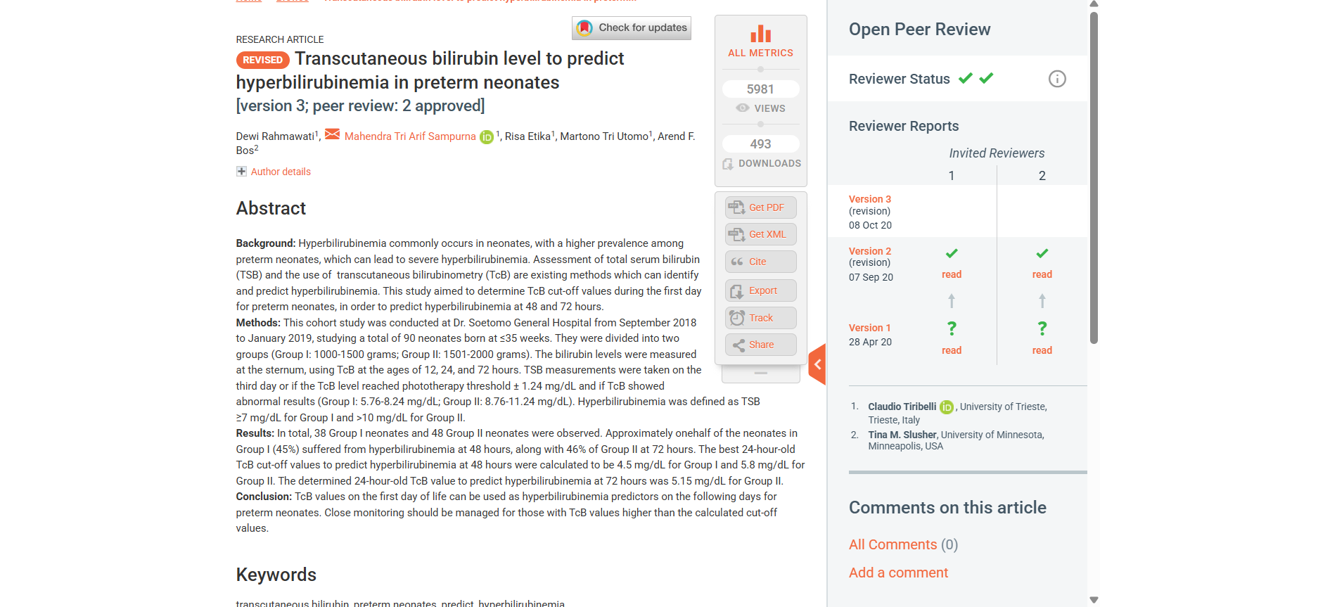 Hiperbilirubinemia umumnya terjadi pada neonatus, dengan prevalensi yang lebih tinggi pada neonatus prematur, yang dapat menyebabkan hiperbilirubinemia berat. Penilaian bilirubin serum total (TSB) dan penggunaan bilirubinometri transkutan (TcB) merupakan metode yang ada untuk mengidentifikasi dan memprediksi hiperbilirubinemia. Penelitian ini bertujuan untuk menentukan nilai batas TcB pada hari pertama neonatus prematur, guna memprediksi hiperbilirubinemia pada 48 dan 72 jam.